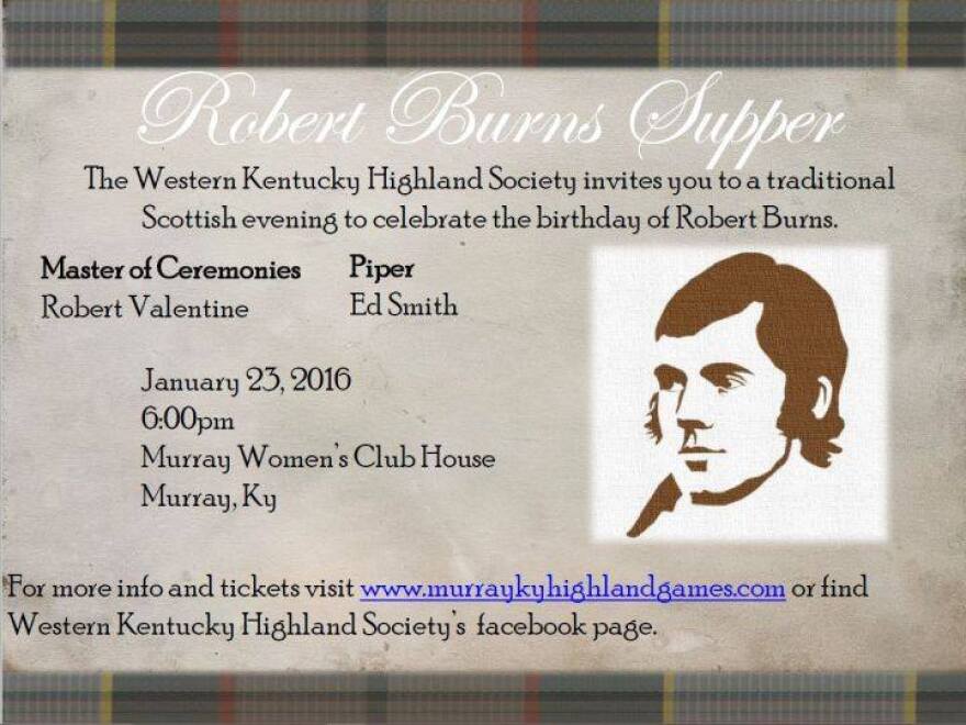 Anyone who sang "Auld Lang Syne" on New Year's Eve sang the words of Robert Burns. Suppers celebrating the Scottish poet have been a global tradition since his death in 1796, and the Western Kentucky Highland Society continues the tradition in Murray on January 23. On Sounds Good, Tracy Ross speaks with proud Scotsman Robert Valentine about Burns, 'neeps and tatties' and a poem about haggis.