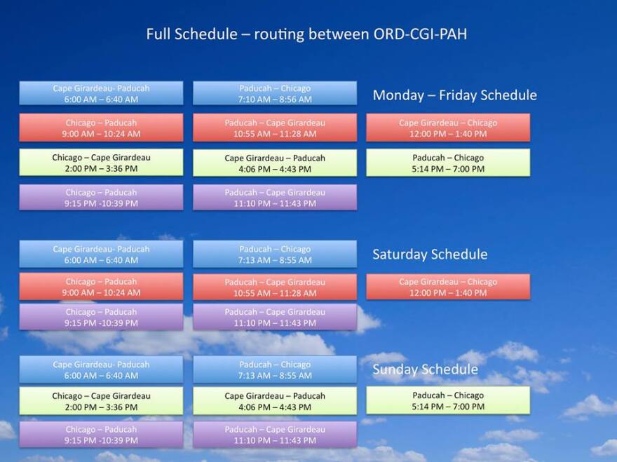Midday flights will connect with Cape Girardeau Regional Airport in Missouri.
