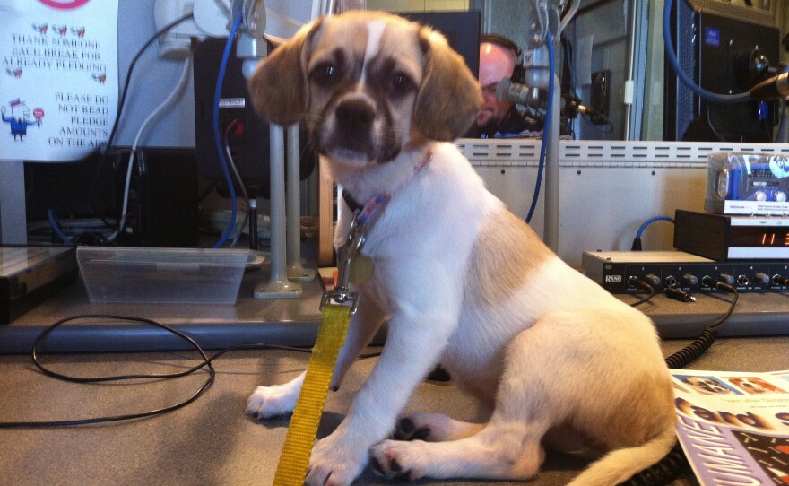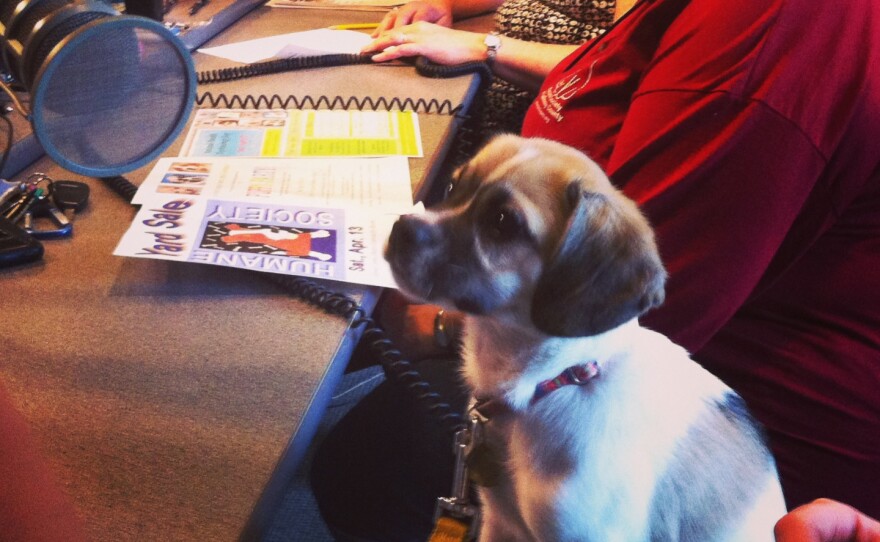 Today we met Bella, a Beagle, Westie, and Pekingese mix. She was born on January 13th, 2013 with three siblings and is available for adoption from The Humane Society of Calloway County. She was very sweet to everyone at WKMS; loved to be held and played with. She got lots of treats because she did such a good job making her radio debut.