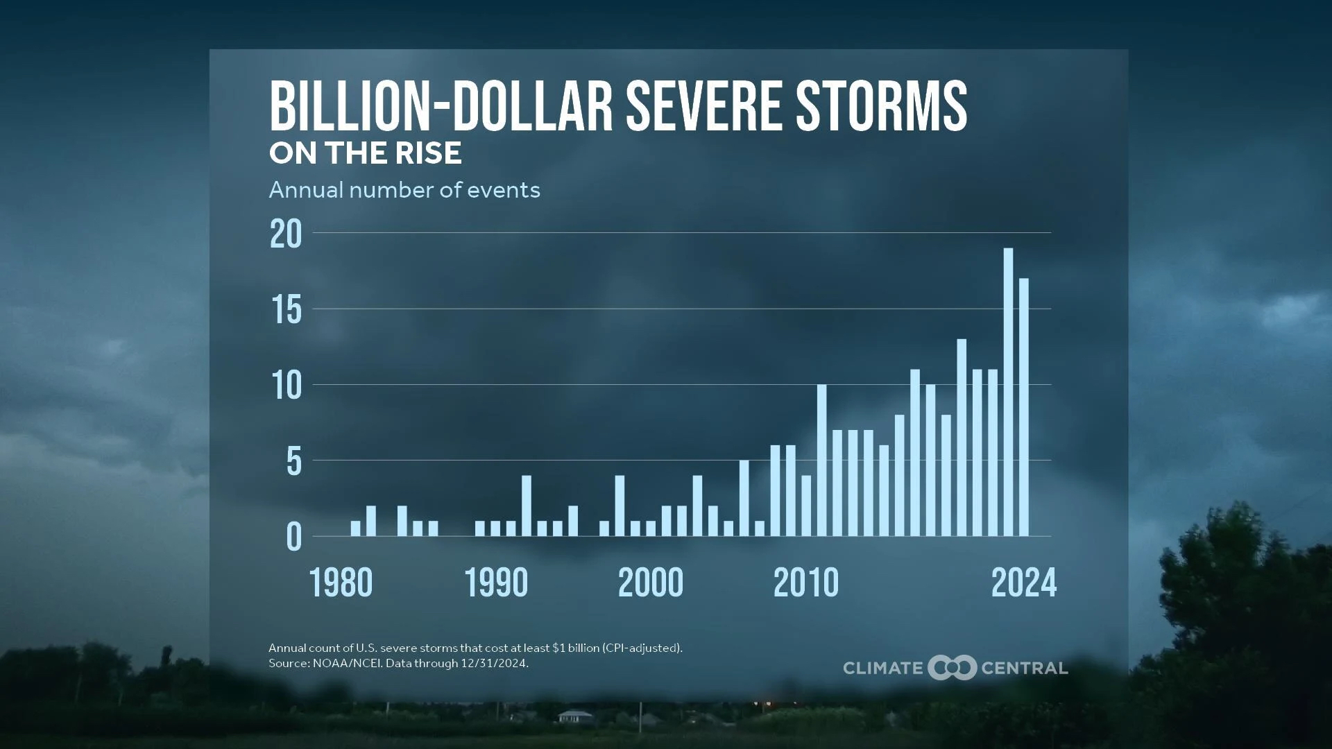 Severe convective storms, which include tornadoes, high winds or hail, represent the most common cause of billion-dollar disasters, according to Climate Central.