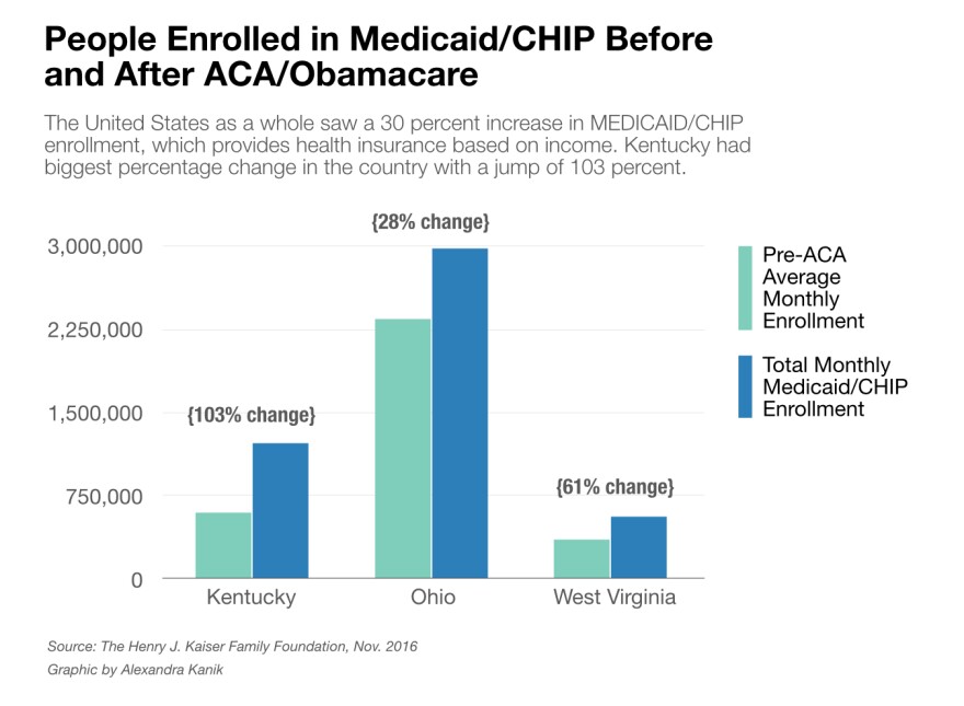 Protesters have focused on the proposed changes to the ACA’s expansion of health coverage under Medicaid. Kentucky, West Virginia and parts of Ohio have seen some of the country’s biggest increases in people covered via Medicaid, and the number of people lacking insurance has dropped sharply since the ACA’s took effect.
