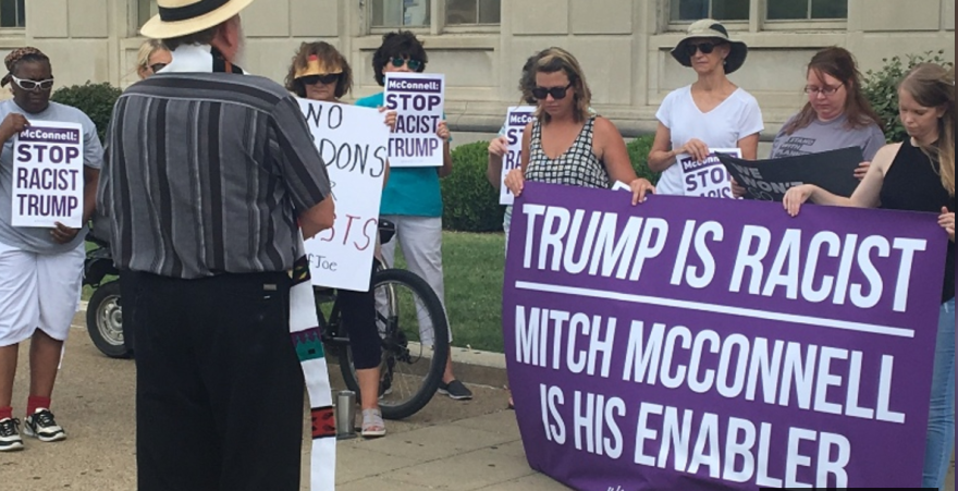 About two-dozen demonstrators held signs and delivered speeches Tuesday outside the Louisville office of Senate Majority Leader Mitch McConnell, demanding that McConnell hold President Donald Trump accountable for comments he made following this month’s deadly white supremacist rally in Charlottesville, Virginia.