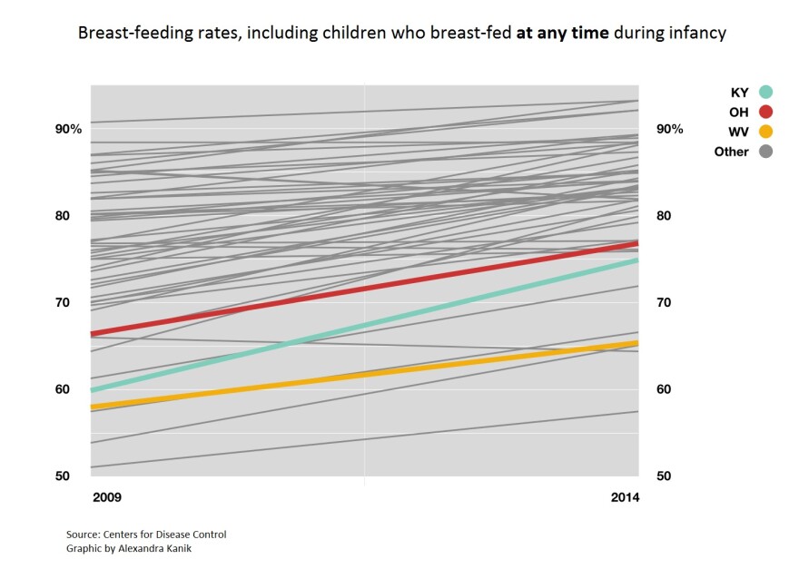 Chertok said there have been lots of efforts to try to promote breast-feeding and the numbers show progress. In Kentucky, for example there was a 15 percentage point increase in breast-feeding between 2009 and 2014.